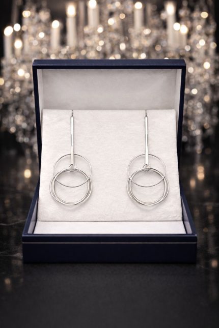 Aros colgantes largos dos hebras por aro con un punto de luz bañados en oro