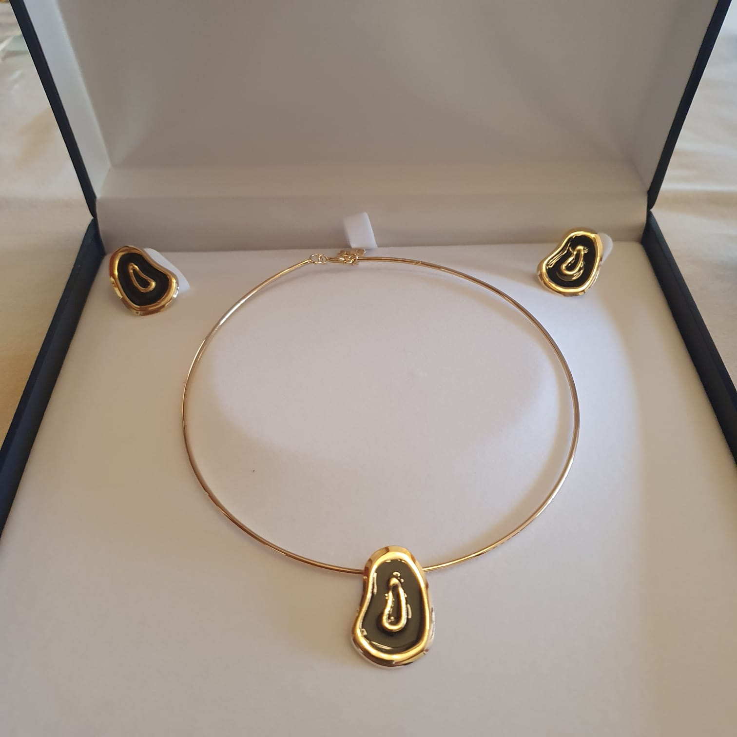 Conjunto collar rígido colgante minimalista color negro y aros de diseño bañados en oro