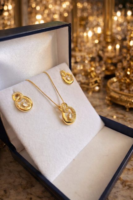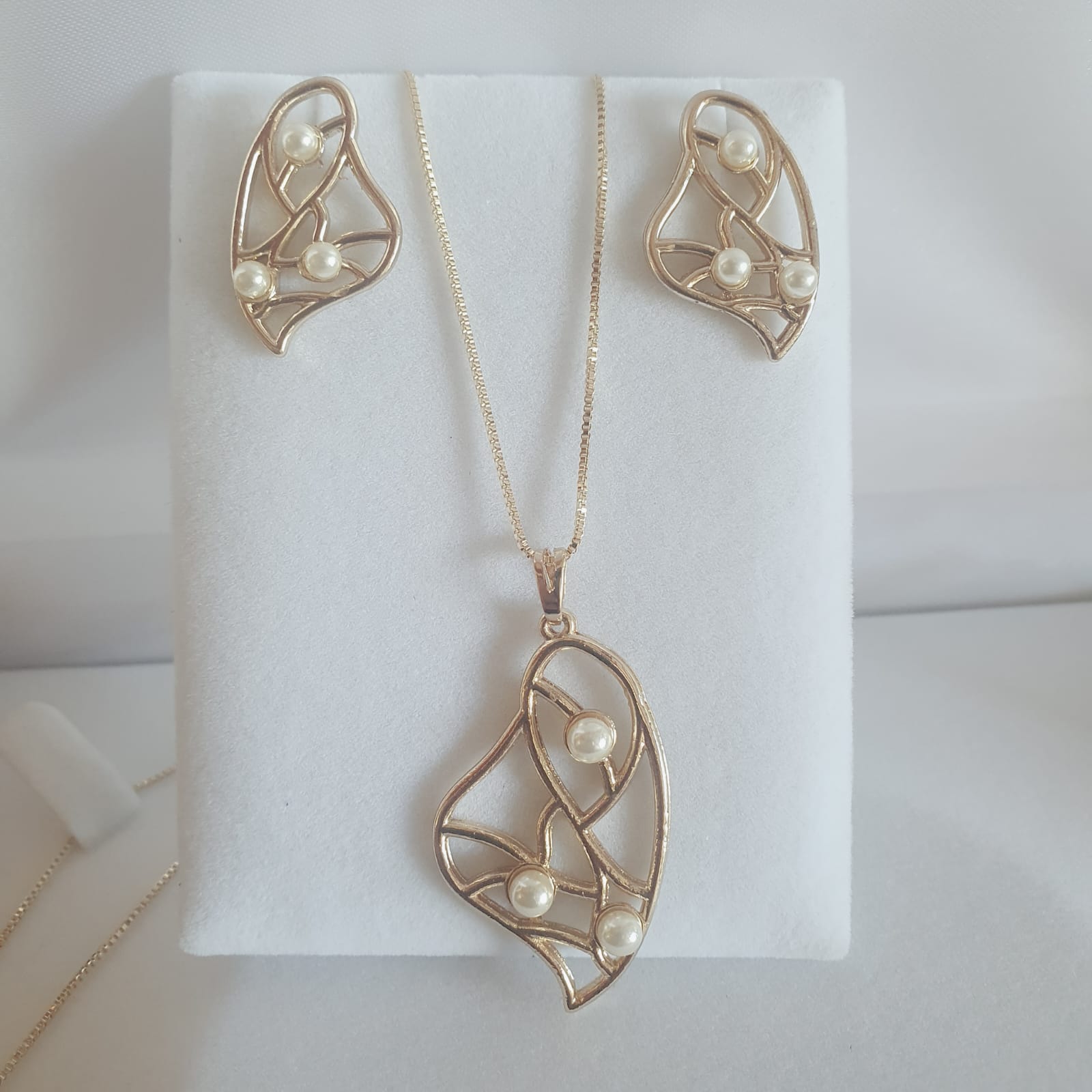 Conjunto bañado en oro forma de hoja con tres perlas por hoja