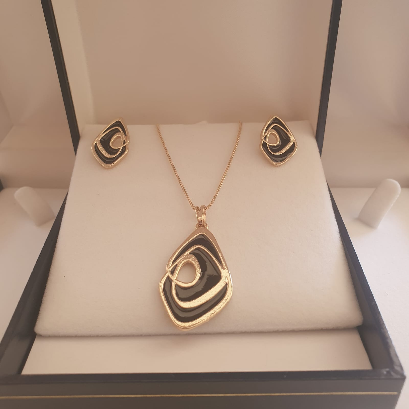 Conjunto de colgante y aros de diseño color negro bañados en oro
