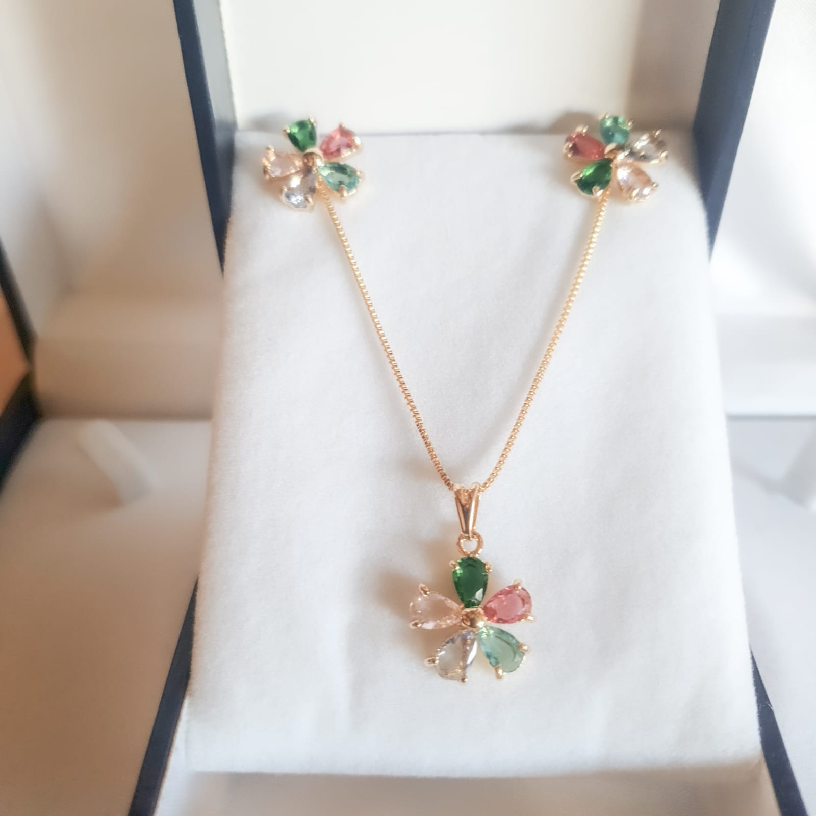 Conjunto de colgante y aros de diseño flor de colores bañados en oro