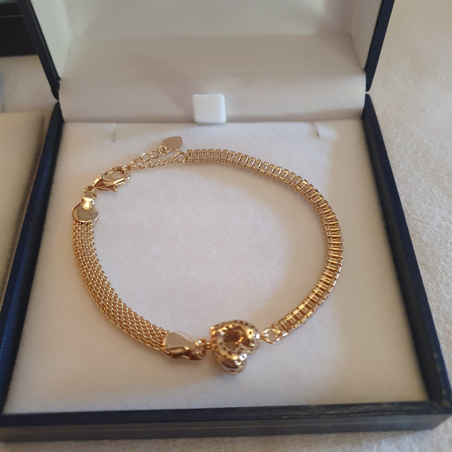 Pulsera doble tejido con corazon bañada en oro 18-20 cm