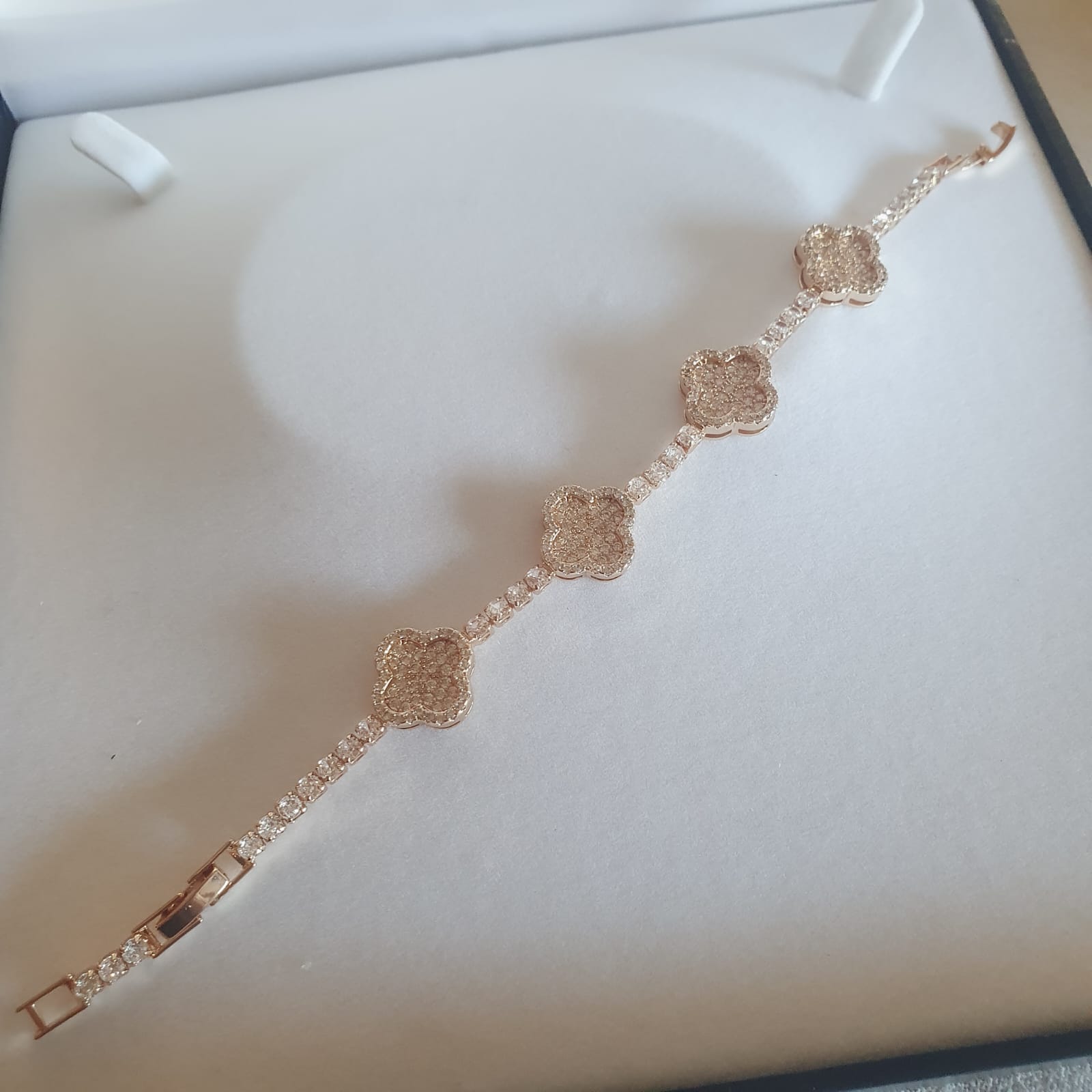 Pulsera broche cajon con cuatro trevoles 18 cm y circones bañada en oro